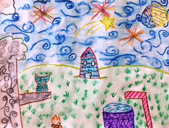 Students chose a memory to draw and added texture and color with a unique watercolor marker and wax resist technique in order to make it look more impressionist than realistic.